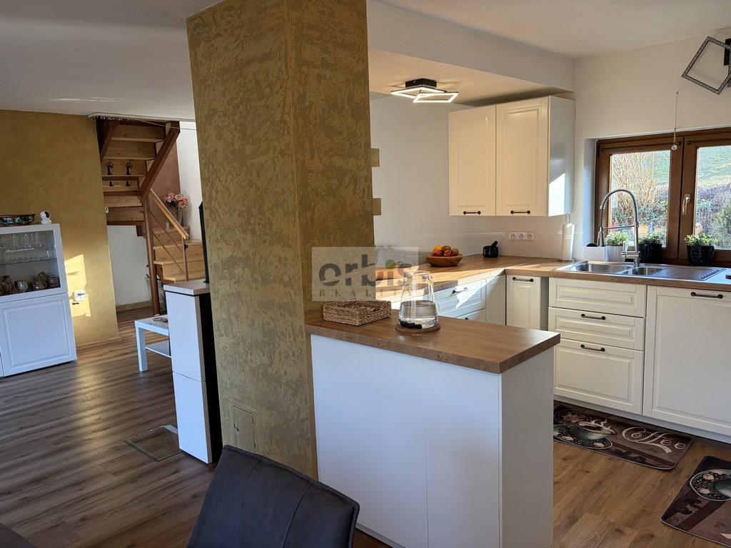 Přízemí: obývací pokoj se sedací soupravou, nová kuchyňská linka včetně spotřebičů (varná deska, elektrická trouba, myčka, lednice, mikrovlnná trouba), jídelní stůl se židlemi, nová koupelna s vanou a WC, pračka a sušička