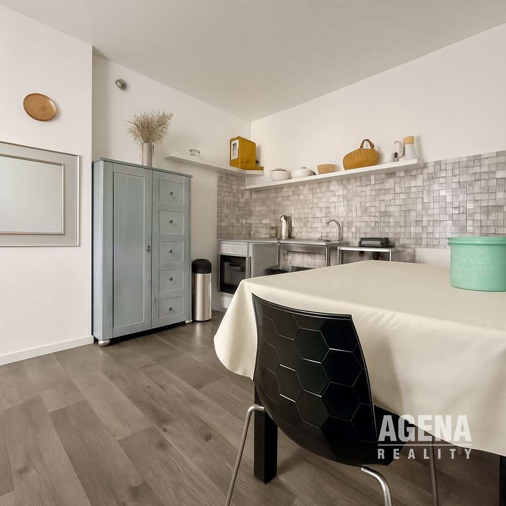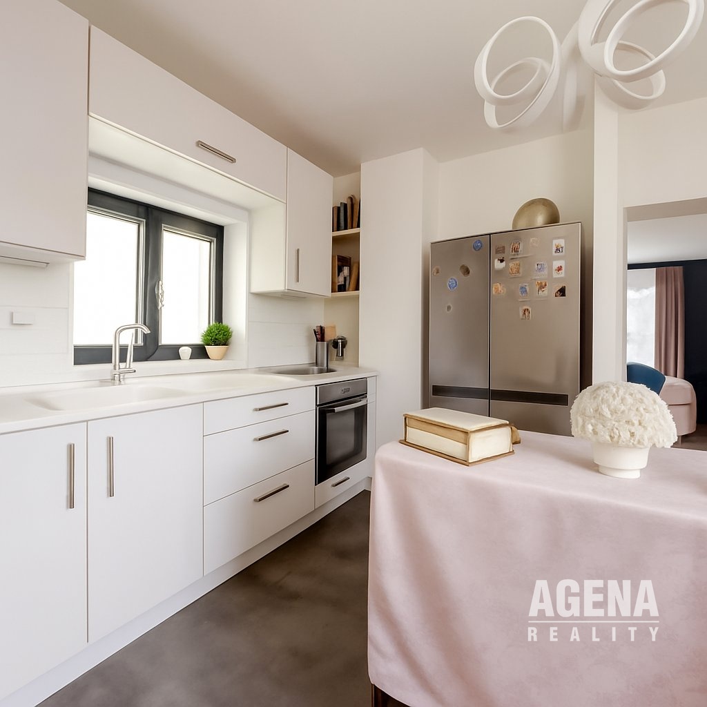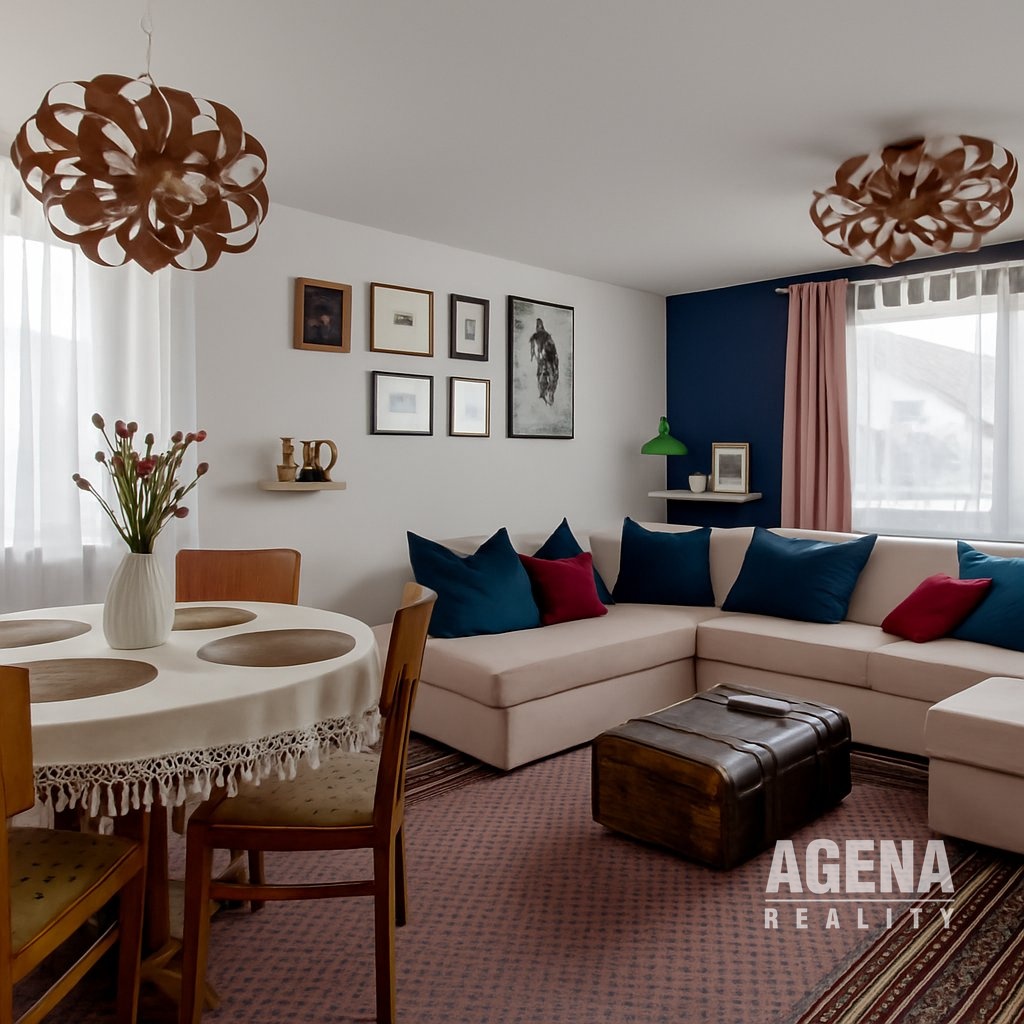 Obývací pokoj (18,5 m²) s kuchyňskou linkou je ideální pro večerní relax u filmu nebo posezení s přáteli.