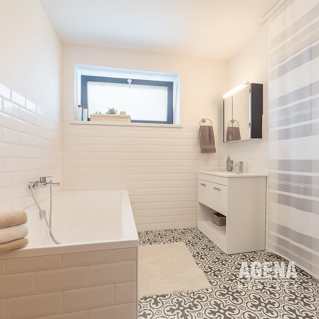 Koupelna je vybavena sprchovým koutem, vanou a WC. Z ní se vstupuje i do technické místnosti s oknem.