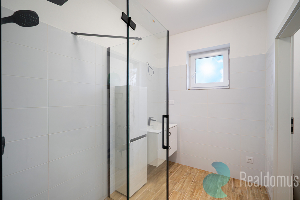 V zádveří této nemovitosti se pak nachází oddělené wc a koupelna se sprchovým koutem propojená s technickou místností.