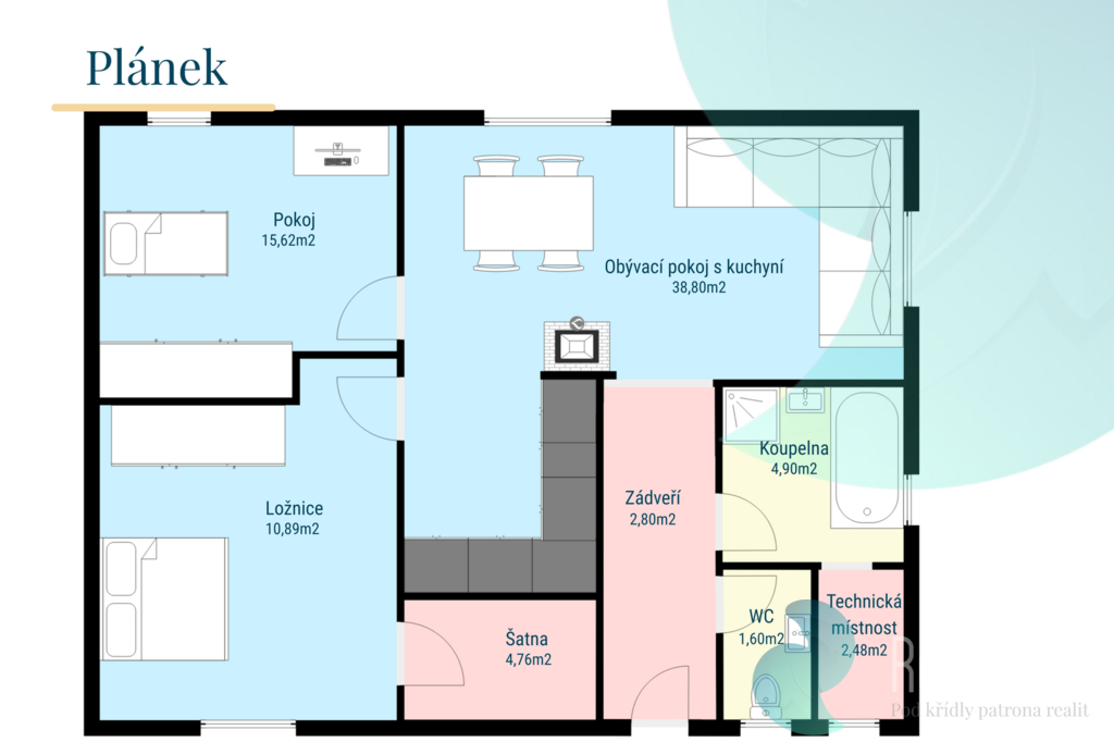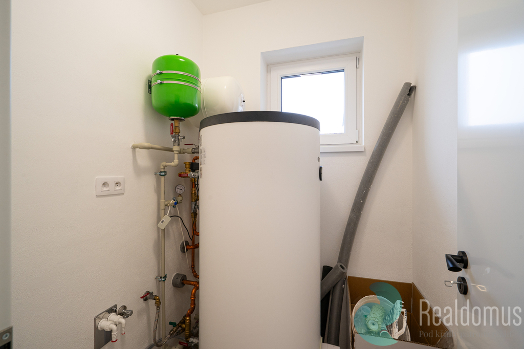Dům je postaven nejen útulně, ale i prakticky. Vytápění je zajištěno tepelným čerpadlem a podlahovým vytápěním v každé místnosti a k tomu je v obývací části domu možnost na připojení krbových kamen, která dotvoří útulnost interiéru i v měsících, kdy se již moc netopí.