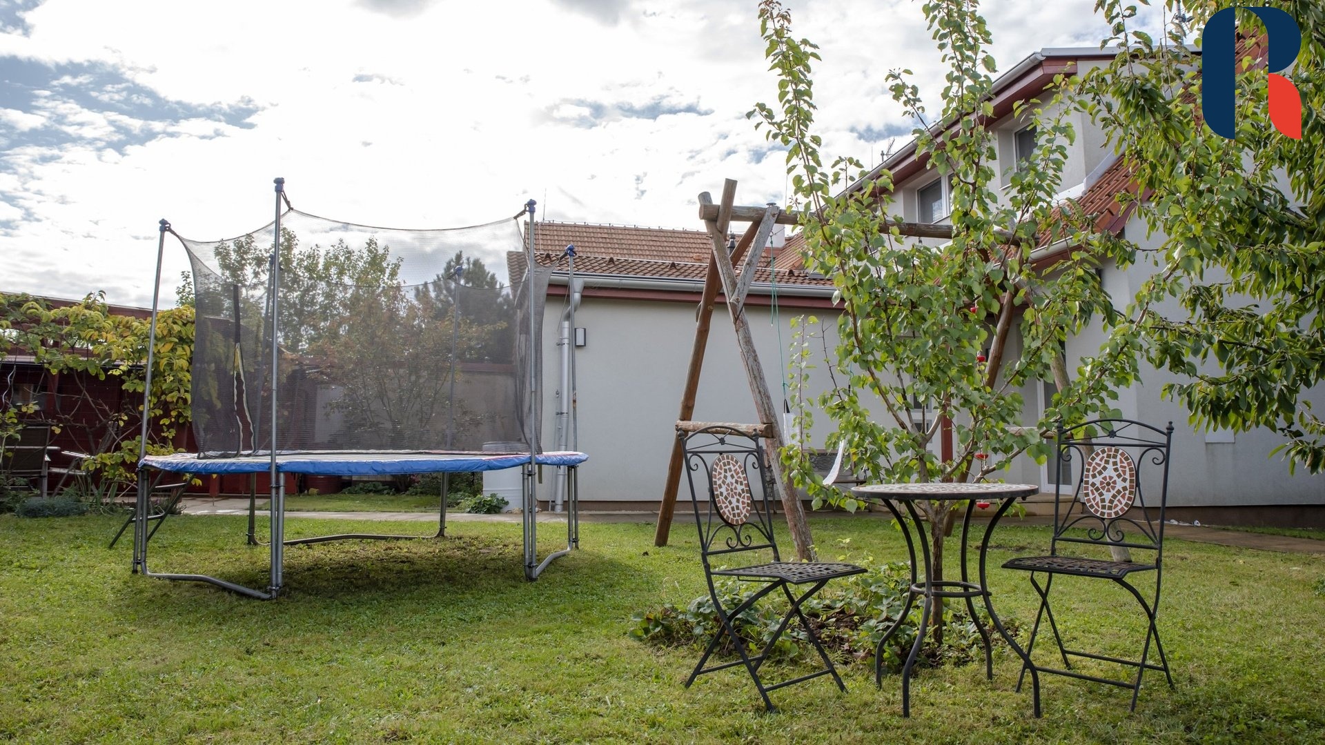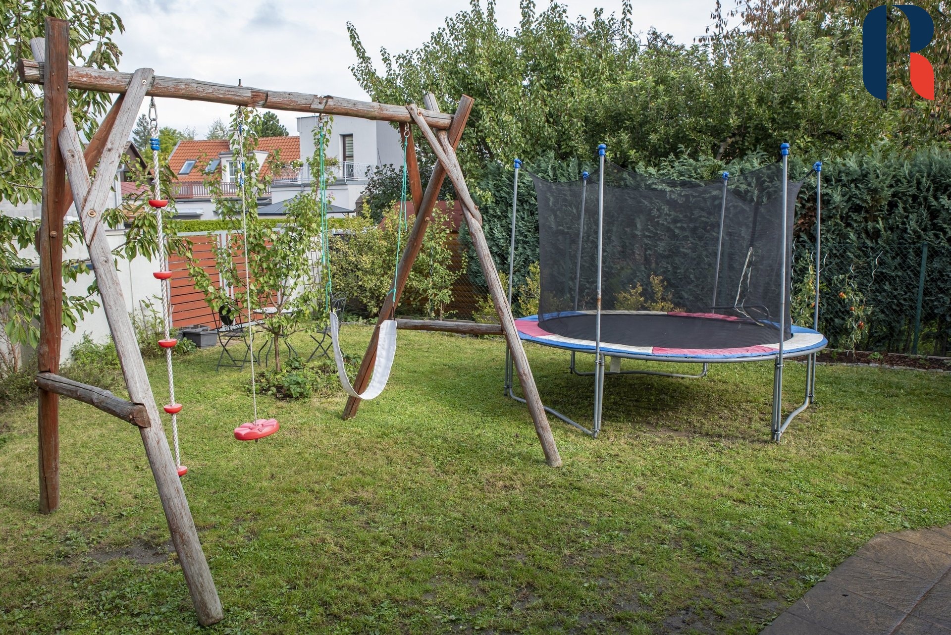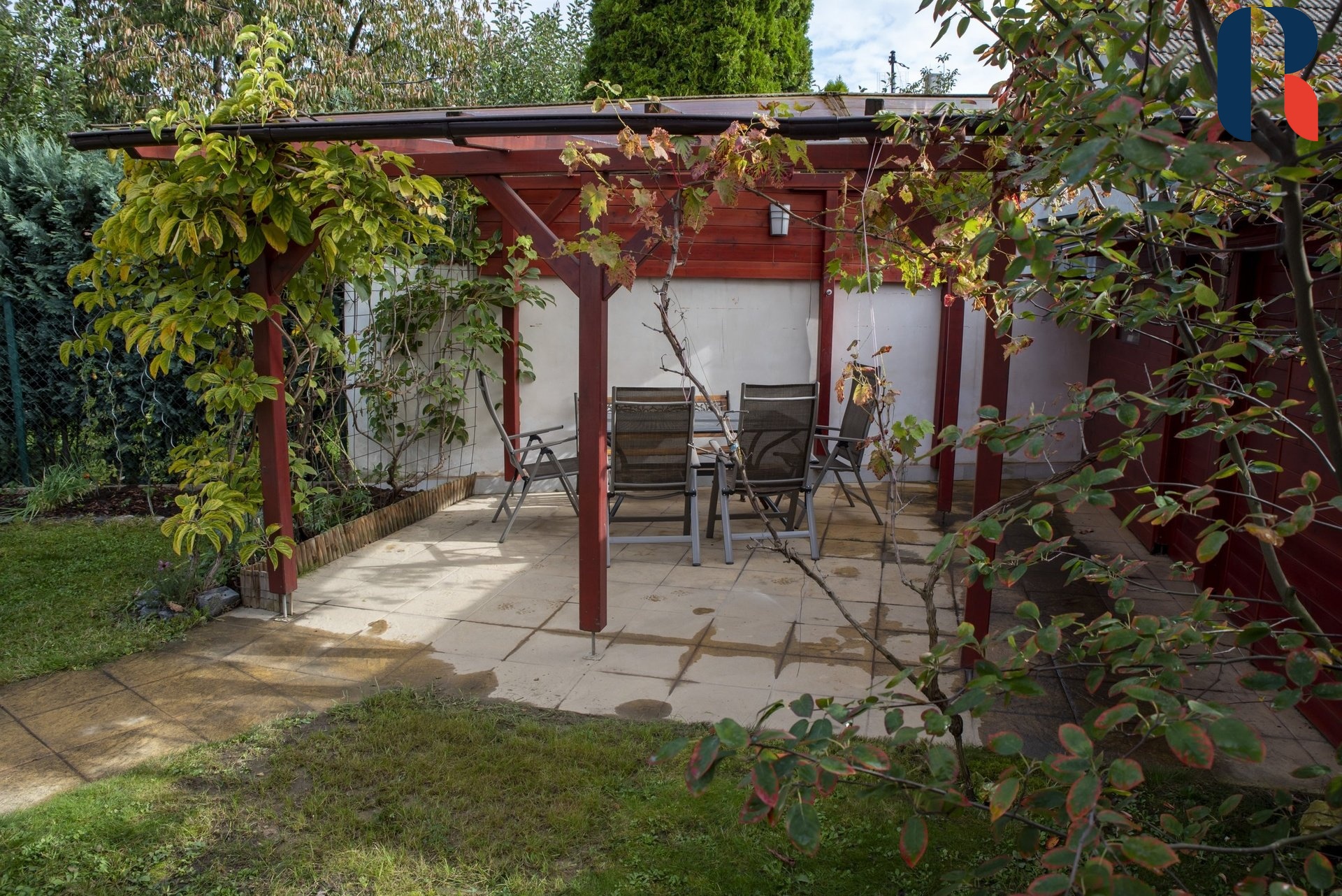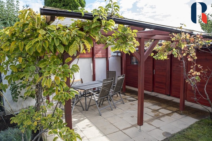 Hezky udržovaná zahrada nabízí ideální místo pro relaxaci, klidné venkovní posezení pod pergolou a dostatek soukromí. Působí příjemným dojmem, nabízí úrodu z vlastních plodin, jsou zde vzrostlé ovocné stromy, záhony se zeleninou, vinná réva a kiwi. Na pergolu navazuje kůlna s dvěma samostatnými uzamykatelnými prostory, které lze využít např. pro uskladnění zahradního nářadí, sekačky, jízdních kol apod.
