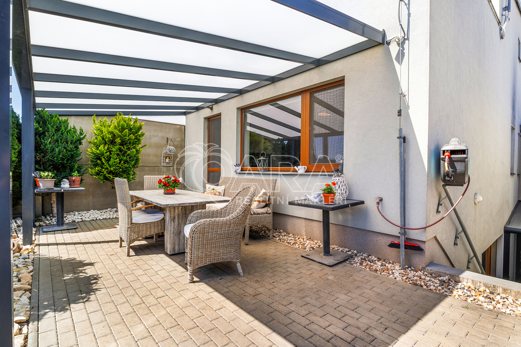 Dominantou celého domu je obývací pokoj o velikosti 42 metrů čtverečních, s úžasným výhledem do zahrady a přímým vstupem na terasu. Díky vysokému plotu si na zahrádce o velikosti 139 metrů čtverečních můžete užívat nerušeného soukromí nebo si užít pohodu s přáteli, třeba při grilování. V kuchyňské části domu najdete kompletně vybavenou kuchyňskou linku s plynovým sporákem, horkovzdušnou i mikrovlnou troubou, vestavnou lednicí s mrazákem a myčkou. Kuchyně díky své velikosti nabízí také dostatek úložných prostor.