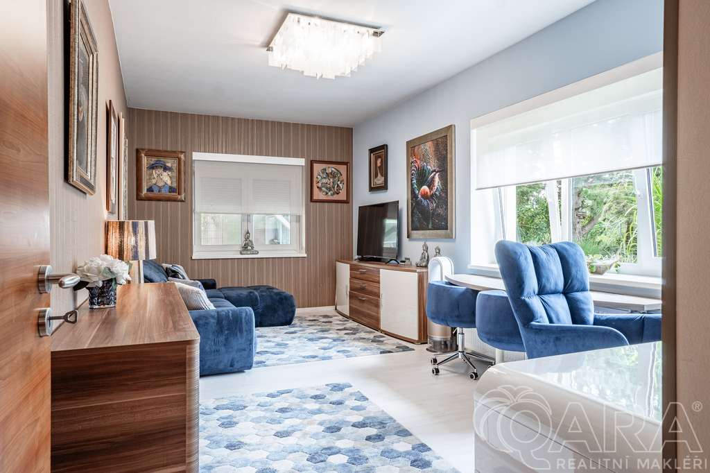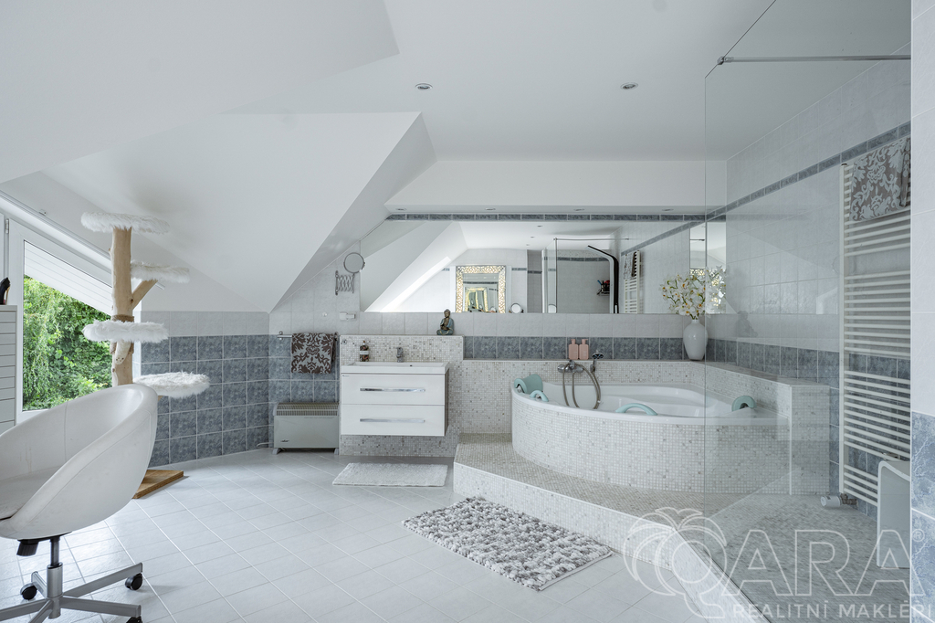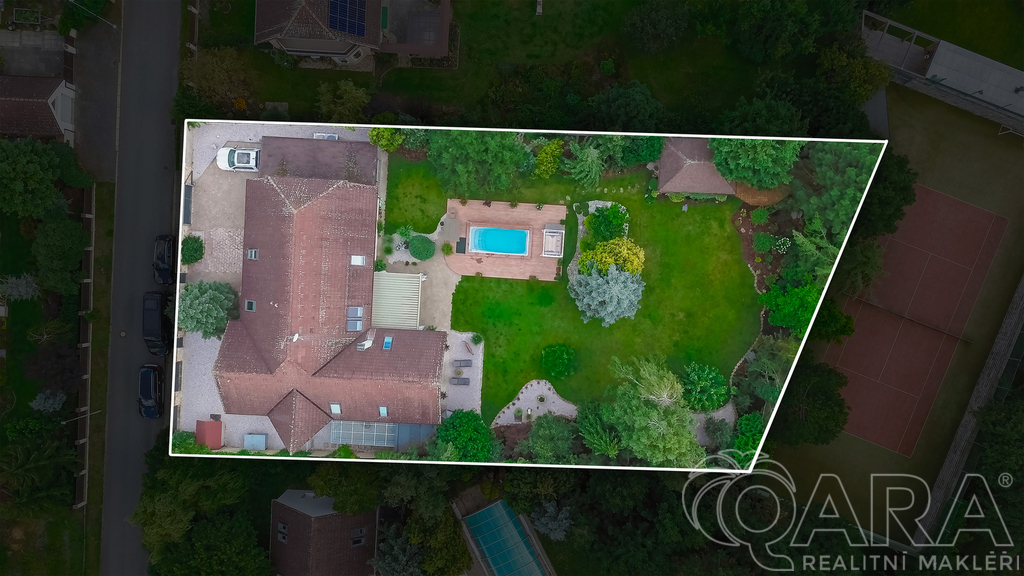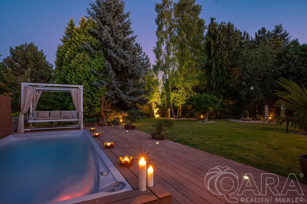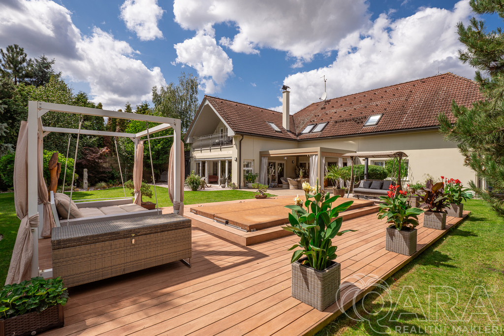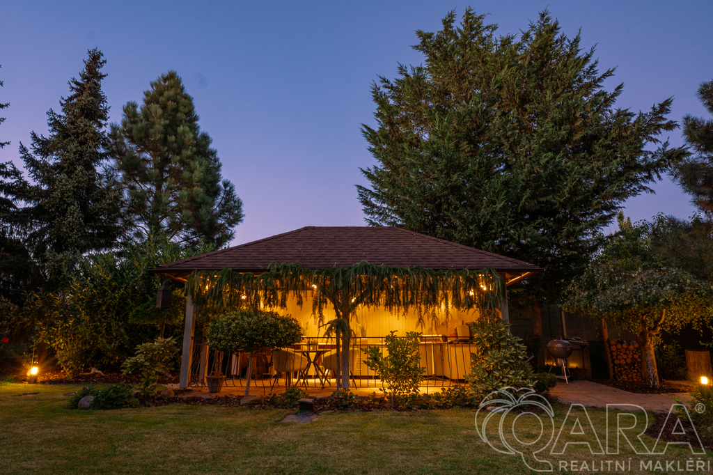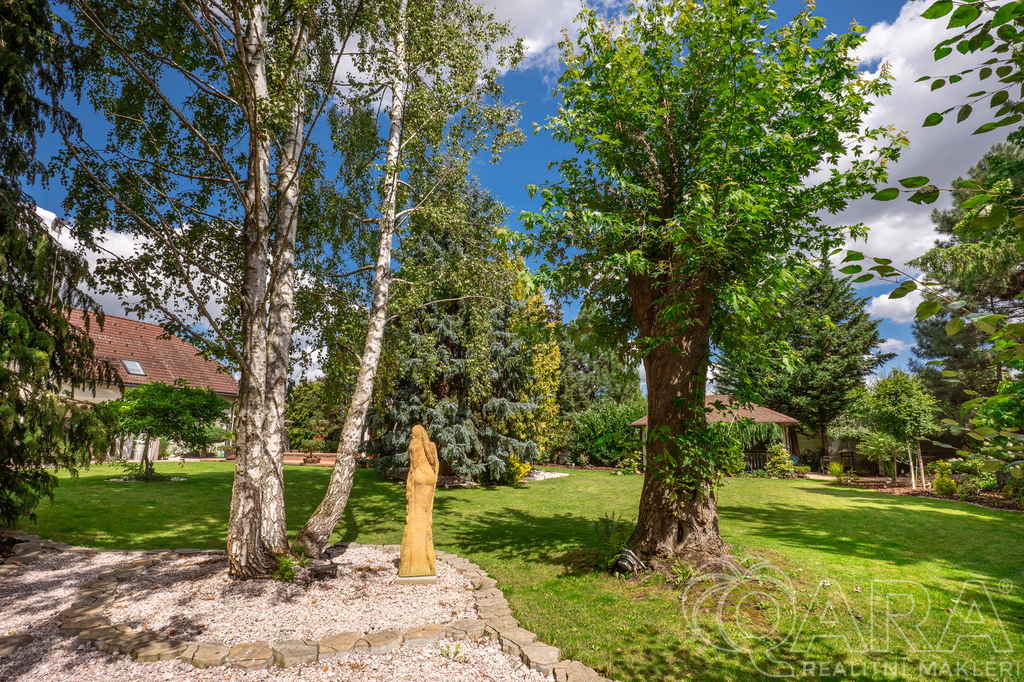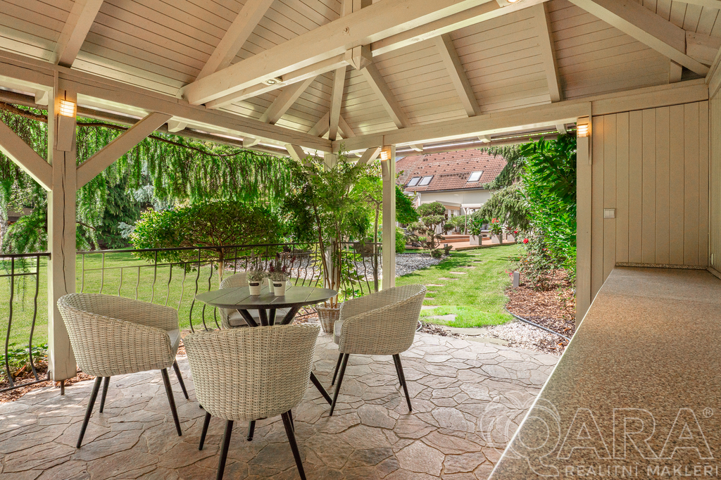 Perfektní stav, promyšlené detaily, soukromá parková zahrada s altánem, dvěma domky, automatickou závlahou, vrtanou studnou a možností parkování až pro osm aut.