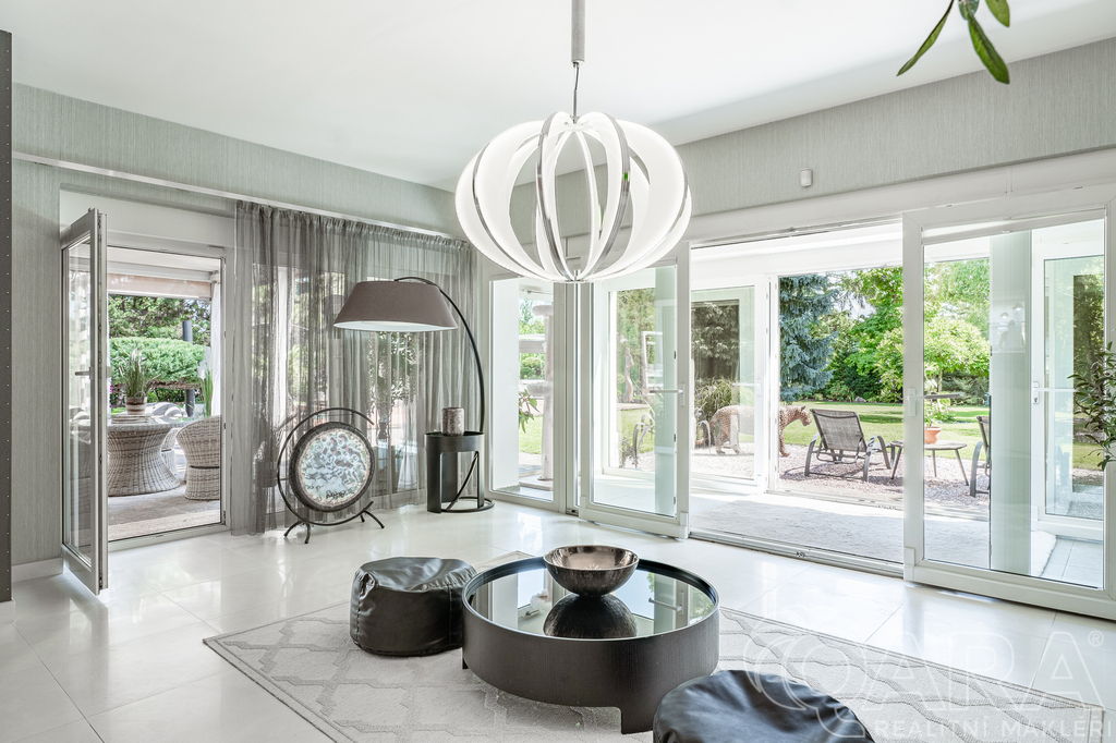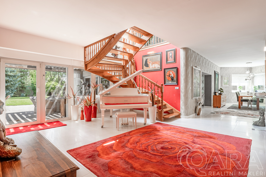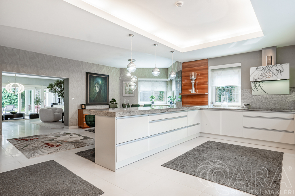• 1. nadzemní podlaží (220 m²) – prostorná vstupní hala, pracovna/pokoj pro hosty, luxusní kuchyň na míru se spotřebiči Miele, jídelna, 2x spíž, obývací pokoj s krbem, zimní zahrada, koupelna pro hosty.