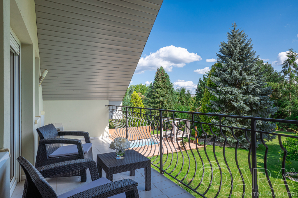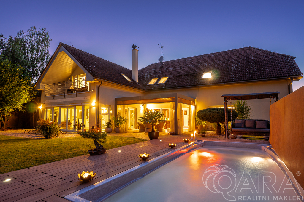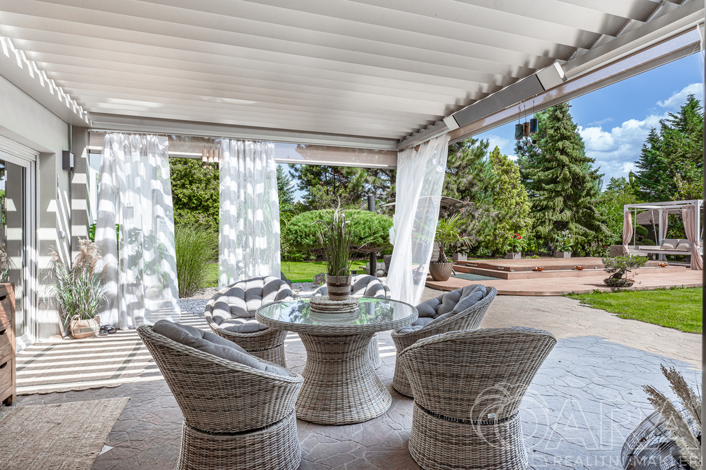 Dům nabízí nadstandardní vybavení, dvě terasy, zimní zahradu, wellness se saunou, profi fitness, plavecké SwimSpa s protiproudem, bioklimatickou pergolu a luxusní kuchyň.