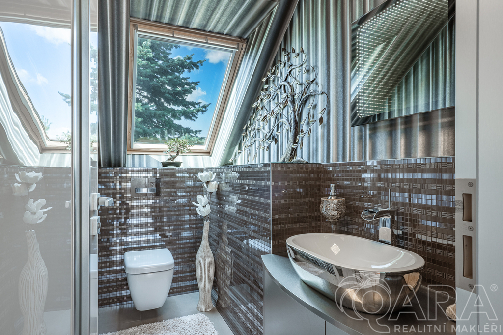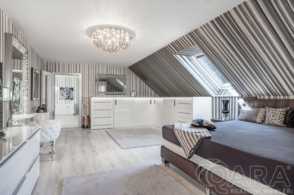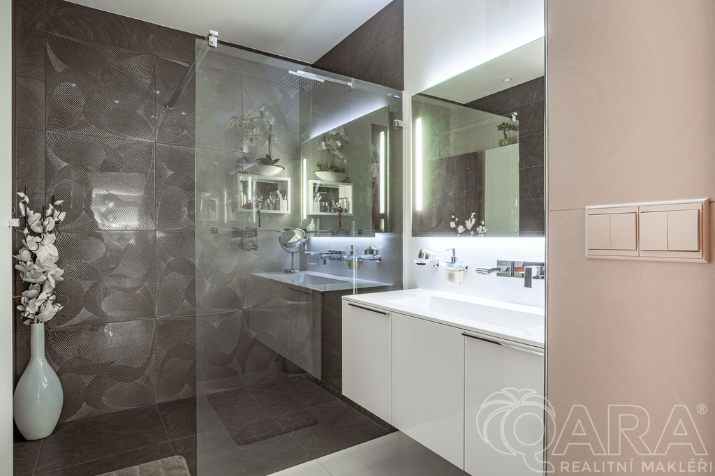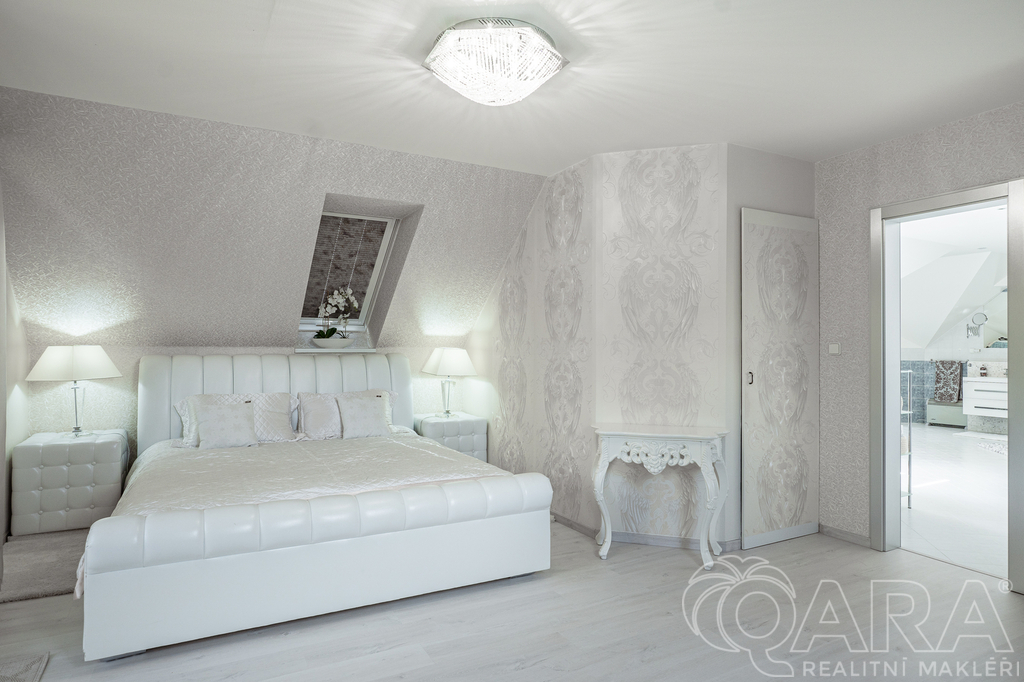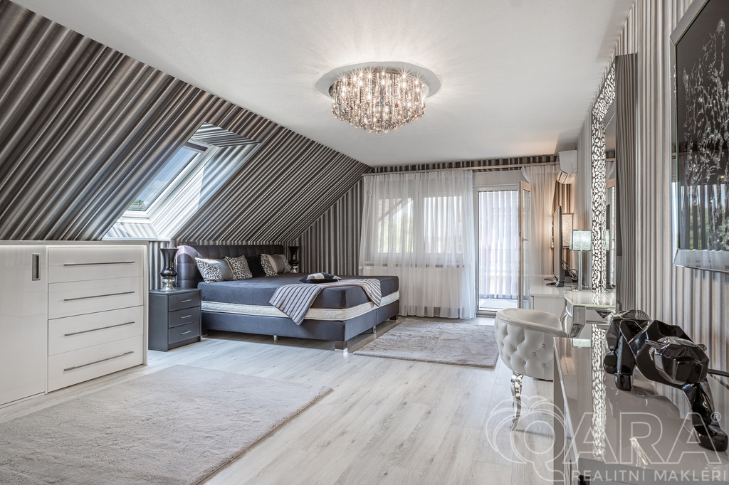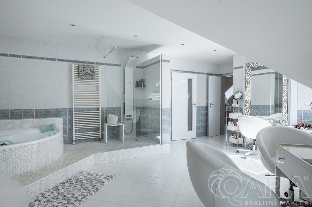 • 2. nadzemní podlaží (212 m²) – 4 ložnice včetně luxusní „černé“ a „bílé“, dvě terasy (jedna zasklená s fitness vybavením), tři šatny, úchvatná horní koupelna 22 m2, kvalitní interiérové dveře Sapeli.