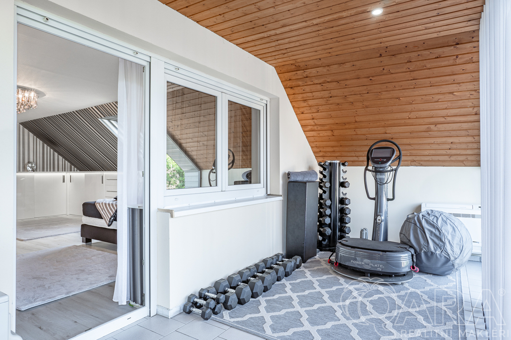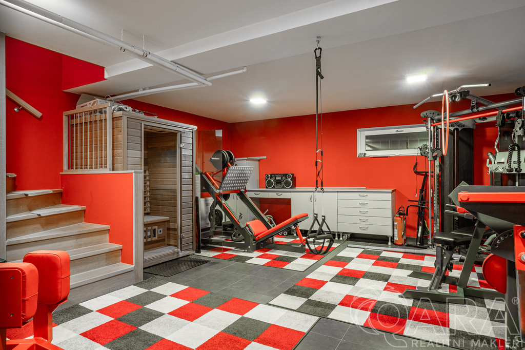 • Suterén (108 m²) – garsoniéra s kuchyňským koutem a koupelnou, wellness zóna s infra saunou a soláriem, profesionální fitness vybavení, technická místnost, úložné prostory.