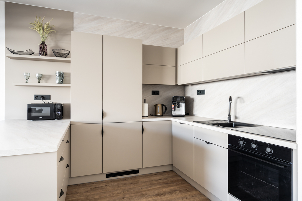 Součástí vybavení bytu je nejen moderní kuchyňská linka včetně vestavných spotřebičů (varná deska, elektrická trouba, digestoř, lednička s mrazákem, myčka nádobí), ale také veškerý nábytek zachycený na fotografiích.