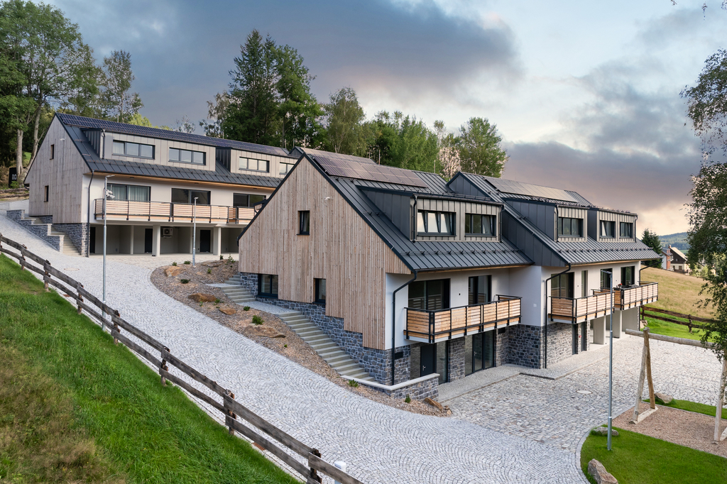 Resort je oplocený, na vjezdu s automatickou bránou, napojený na zpevněnou obecní komunikaci a chráněn kamerovým systém. Na pozemku je také dětské hřiště a ohniště. Otopný systém je doplněn fotovoltaickými panely na střechách obou budov. Takto získanou elektrickou energii mohou společně využívat obyvatelé resortu pro provoz svých domácností.