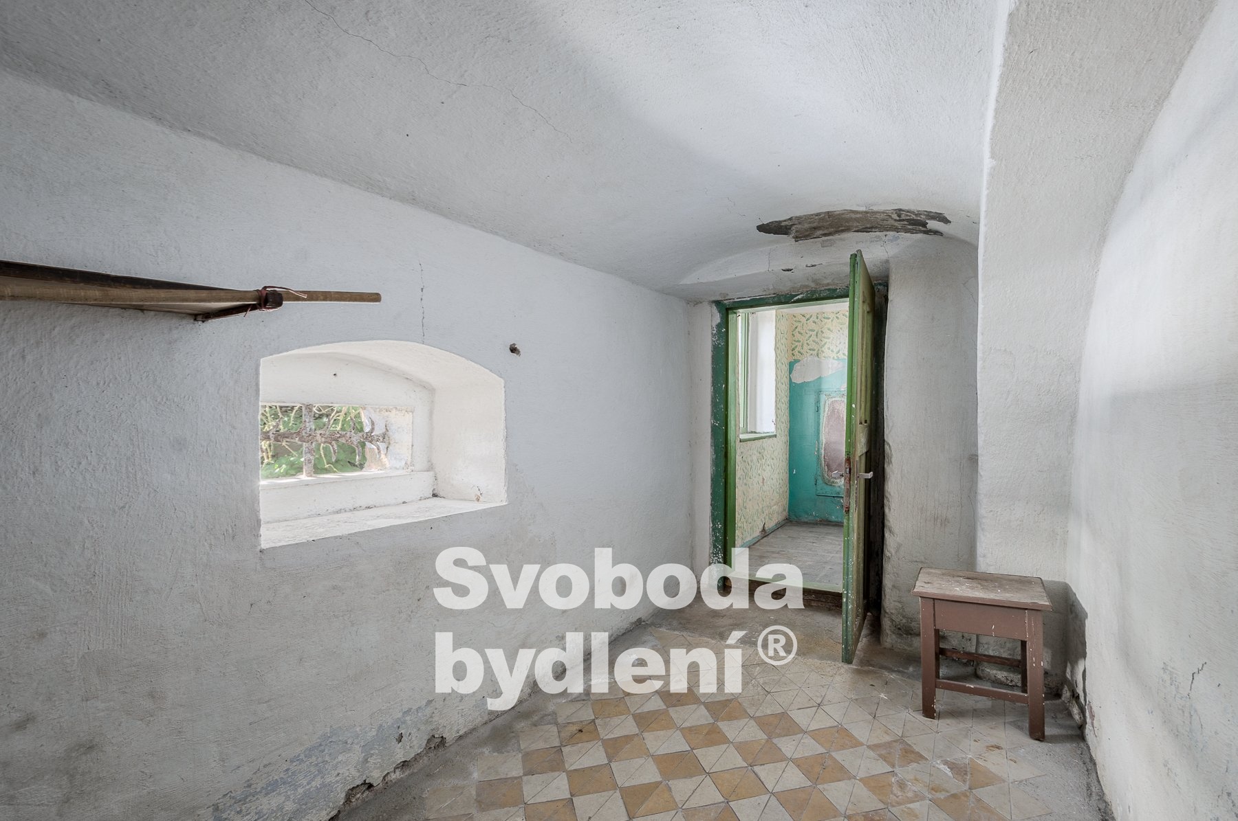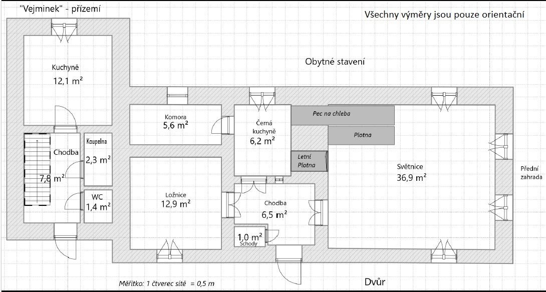 Vlevo od vstupu do vejminku se nachází dveře do bývalého chléva ( cca 15 m2). Poslední dveře vedou do bývalé dílny (cca 90 m2, výška stropu cca 2,5m), ze které je vstup do zadní místnosti (cca 13 m2).