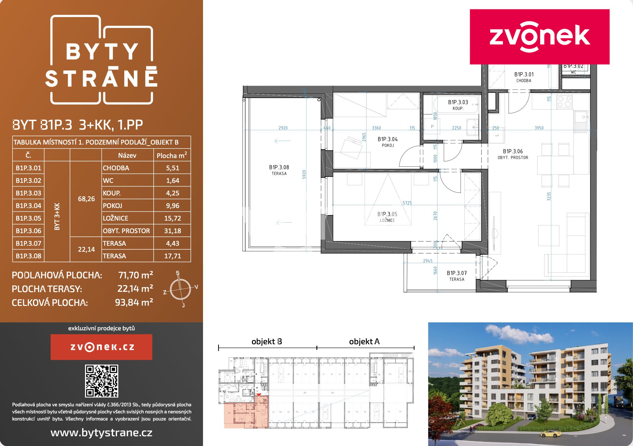 Nabízím k pronájmu nový byt 3+kk s velkou terasou ve Zlíně na ulici Nad Stráněmi, přímo naproti UTB – Fakultě informatiky. Celková výměra vnitřních prostor činí 72 m², k dispozici jsou navíc dvě terasy o celkové velikosti 22 m² orientované na jih a na jihozápad, které poskytují příjemné posezení. Dispozici tvoří tři samostatné místnosti, koupelna s vanou, toaleta a vstupní chodba. Součástí nabídky je také prostorný sklad o velikosti 6 m² umístěný v suterénu domu.