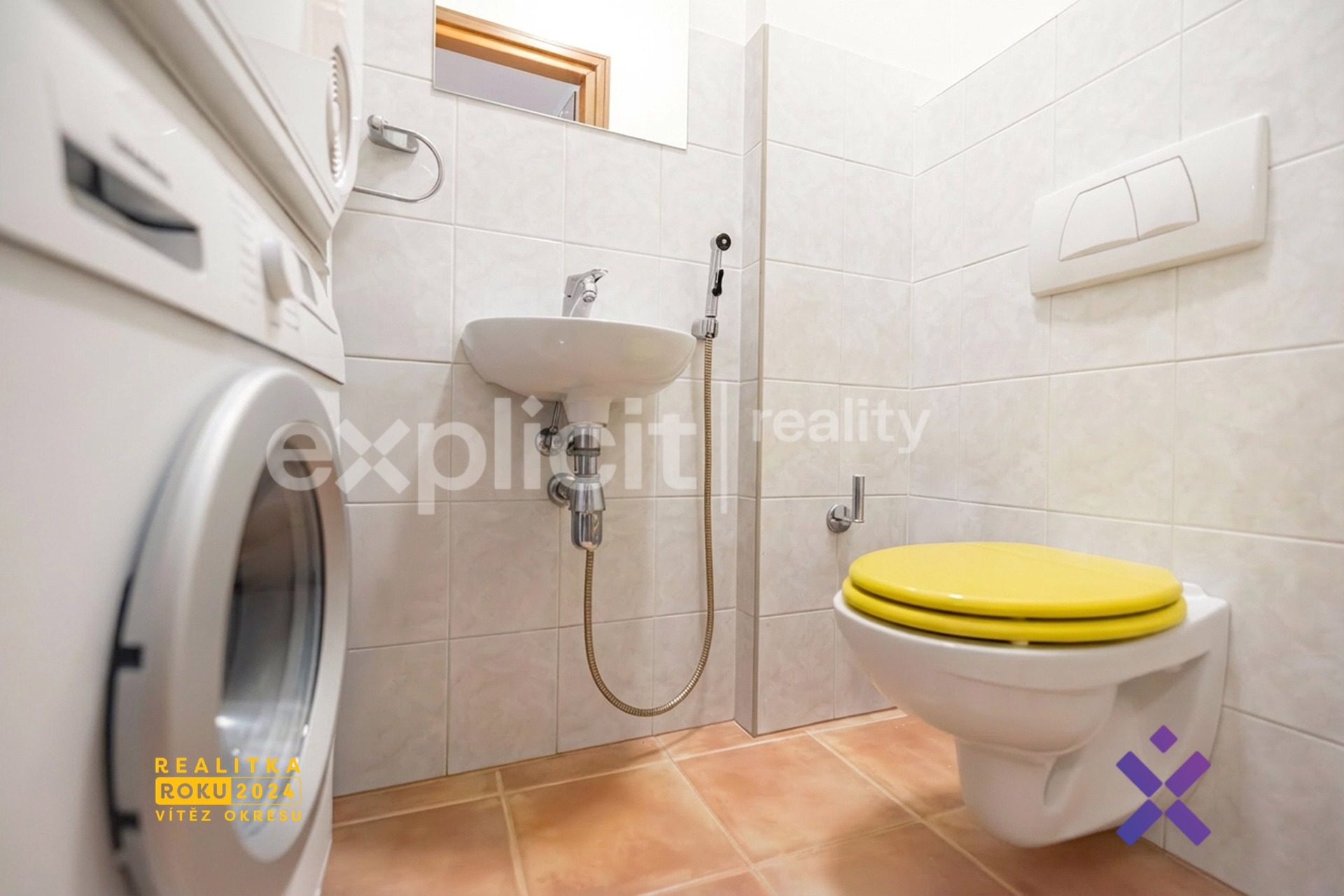 Po vstupu do bytu vás přivítá otevřený a světlý prostor. Po pravé straně zádveří se nachází samostatné WC, pračka a sušička. Chodba dále vede ke koupelně vybavené vanou, velkým umyvadlem, toaletou a bidetem. Následně plynule přechází do kuchyňské části bez dveří. Kuchyňskou linku tvoří vestavná trouba, kombinovaná varná deska a digestoř, rohový dřez, myčka nádobí, dostatek skříněk, vestavná mikrovlnná trouba a vkusný regál na víno. Pracovní plocha je prakticky u okna. Hlavní obývací prostor navazuje na lodžii a dvojí dveře na další pokoj, který lze příčkou rozdělit na půl. Celkově byt působí čistě, svěže a nabízí velmi příjemné bydlení. V celém bytě je instalováno podlahové vytápění.