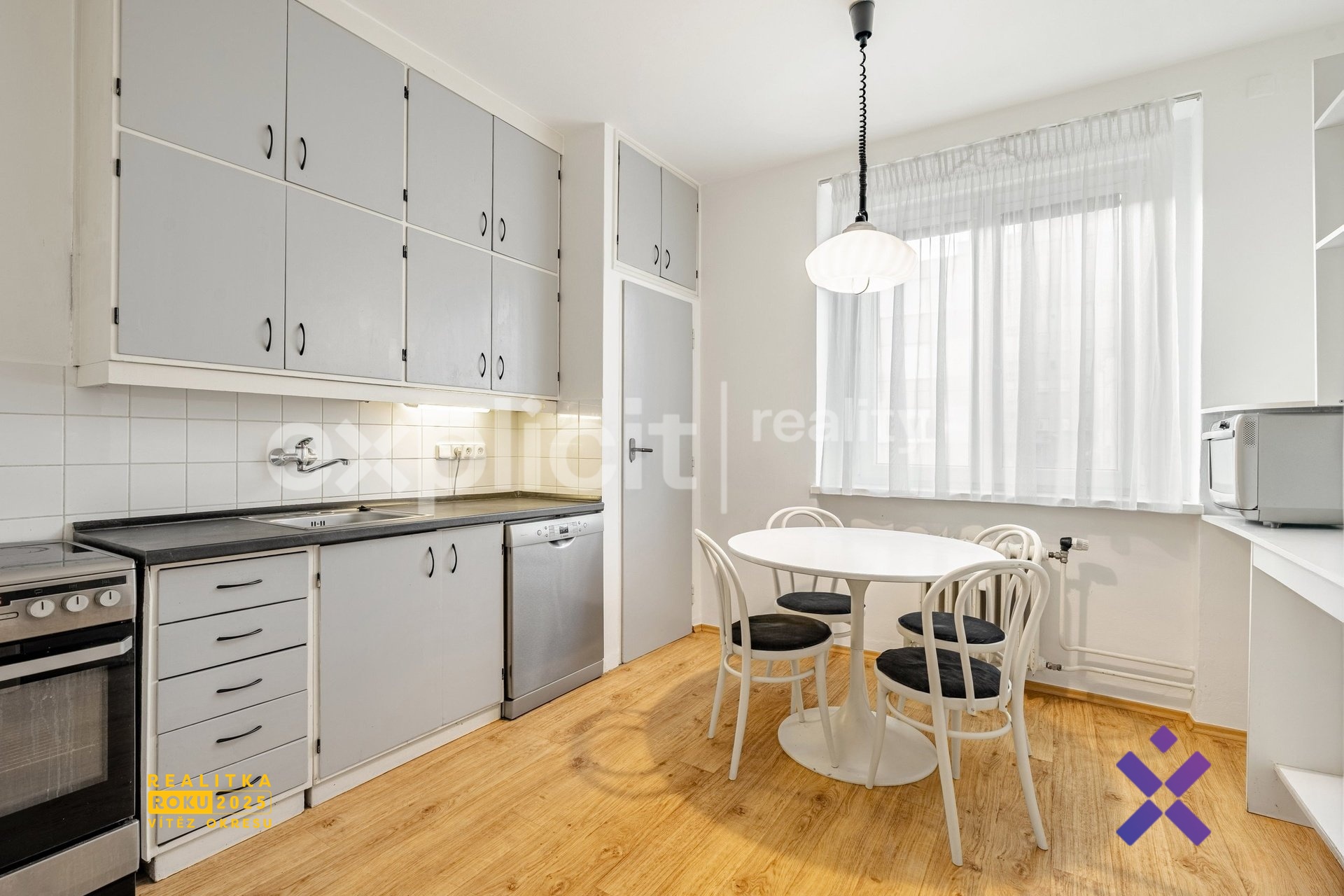 Byt má praktickou dispozici a působí vzdušně díky dobře řešenému prostoru a dostatku úložných míst. Samostatná kuchyň je vybavená troubou, lednicí, myčkou, mikrovlnnou troubou a jídelním stolem, takže je připravená k okamžitému užívání. Součástí je také spíž na potraviny a drobnosti, které chcete mít po ruce, ale ne na očích.