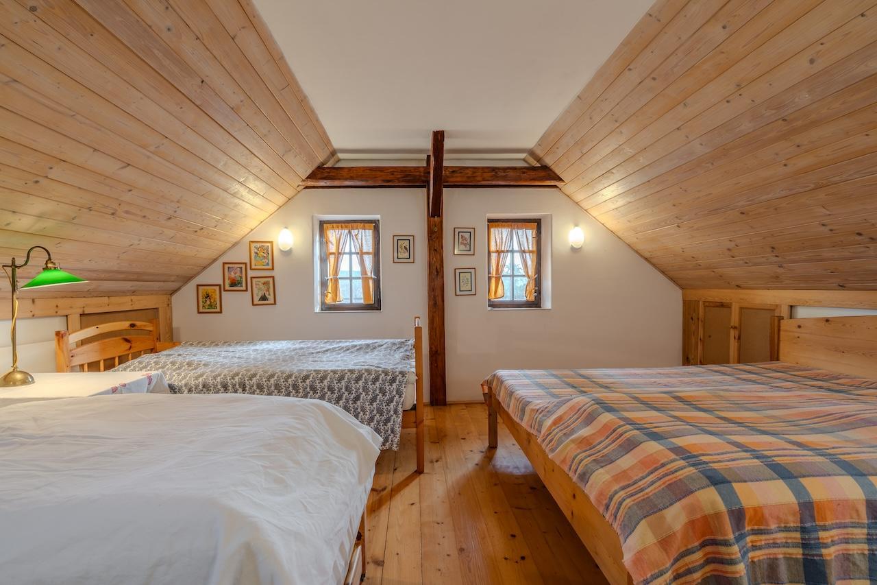 V patře jsou pak tři samostatné ložnice a toaleta. Pro skladování potravin slouží sklep (7m2) se vstupem ze zahrady a schodištěm navazuje velká garáž, která byla vybudována spolu s novým štítem domu cca před 20lety. Garáž má cca 40m2 a sloužila jako dílna s truhlárnou (s případným vyklizením se po dohodě počítá).